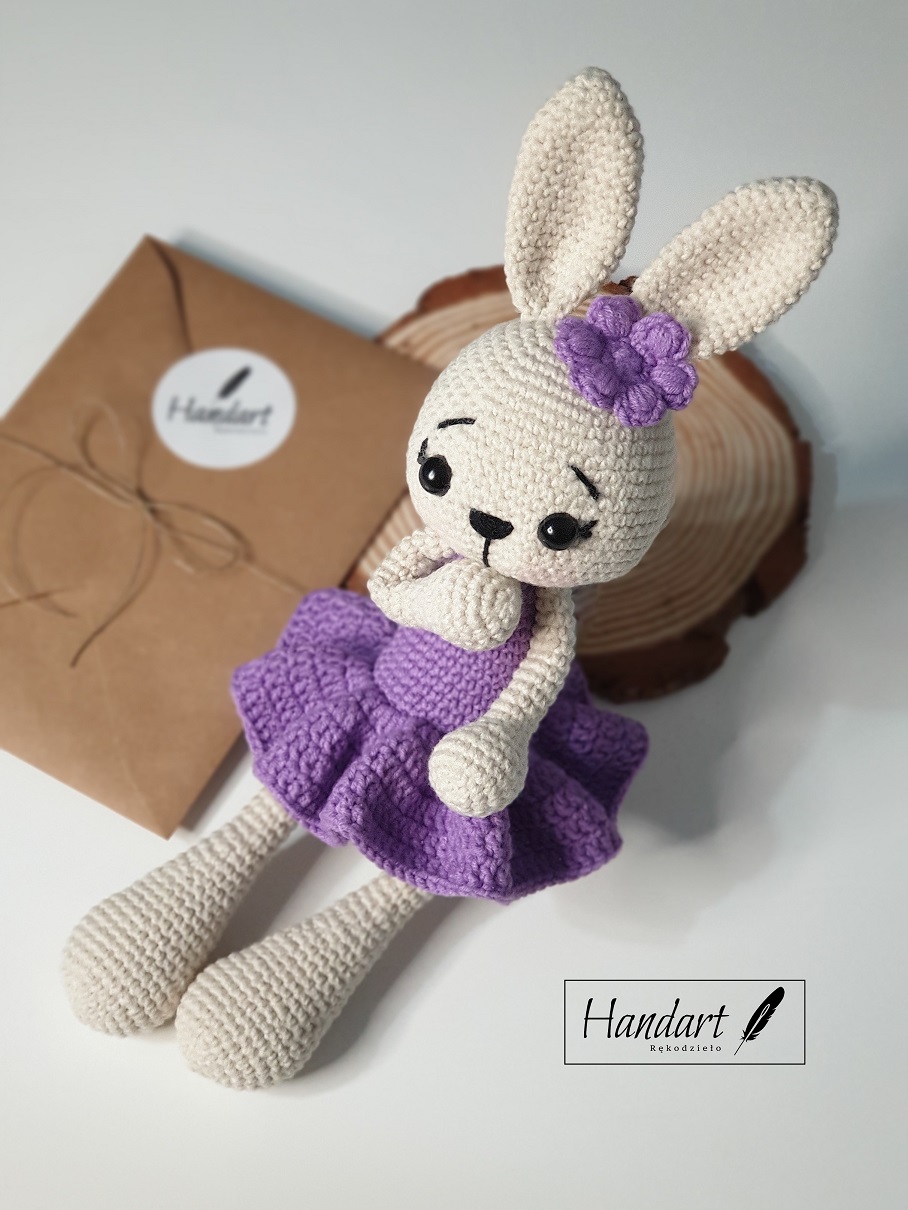 Kolory: Kremowy króliczek w fioletowej sukience.